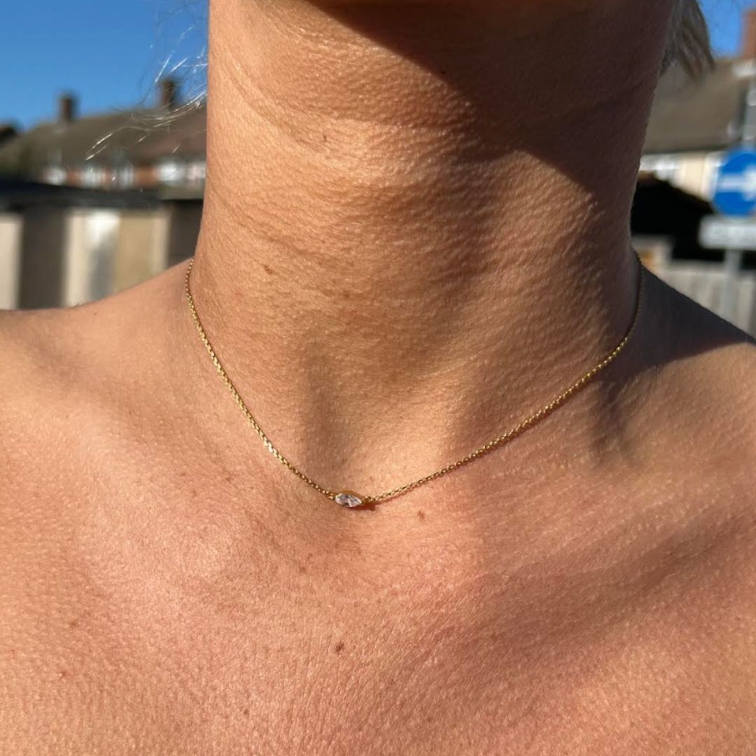 This beautiful fine chain Marquise necklace hand-crafted with white cubic Zirconia, made with an extender chain, wear as a choker style or longer.