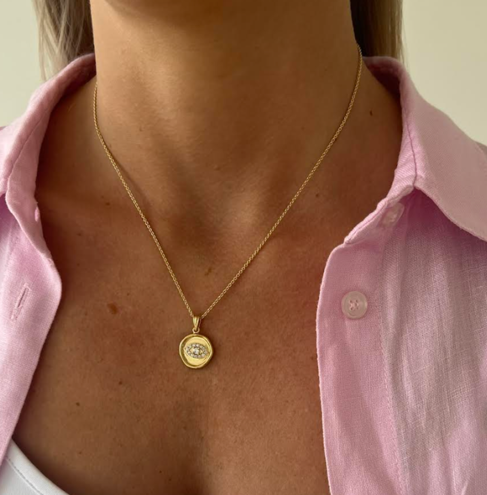 This beautiful hand-designed evil eye pendant features small crystals creating the eye, it symbolises protection to warn off evil forces. Handcrafted in 14k gold vermeil.